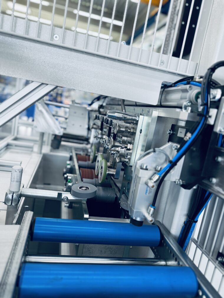 In der ersten Station werden die extrudierten Profile bevorratet und manuell durch einen Bediener auf eine Rollenbahn aufgelegt. Dies ermöglicht eine ergonomische und effiziente Zuführung in den weiteren Prozess. - Fixierung und Ausrichtung